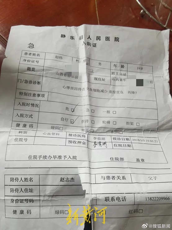 另根據一張入院證明,趙偉曾於1月5日到靜樂縣人民醫院就醫,診斷顯示患者全血細胞減少,重度貧血,出現心悸現象,疑似有再生障礙性貧血。