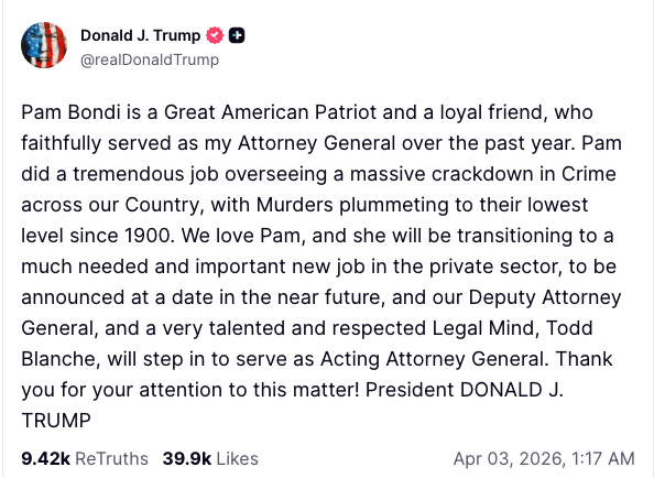 — Attorney General Pamela Bondi (@AGPamBondi) April 2, 2026
