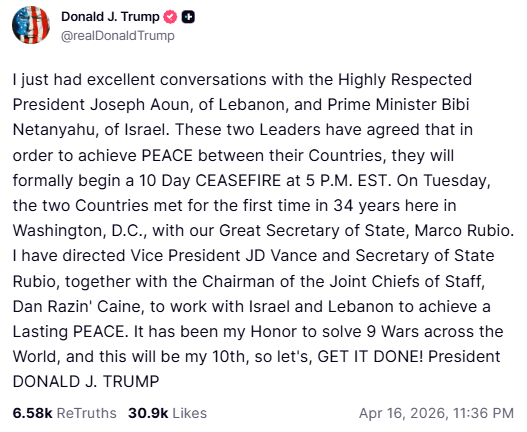 以色列與黎巴嫩之間為期10天的停火於16日生效,貝魯特傳出慶祝性槍響,美國總統川普(Donald Trump)表示,美國與伊朗最快可能在周末再度會談,為伊朗戰爭可能接近尾聲增添樂觀氣氛;他並計劃邀請以色列總理納坦雅胡(Benjamin Netanyahu)及黎巴嫩總統奧恩(Joseph Aoun)前往白宮會談,尋求「長久和平」。