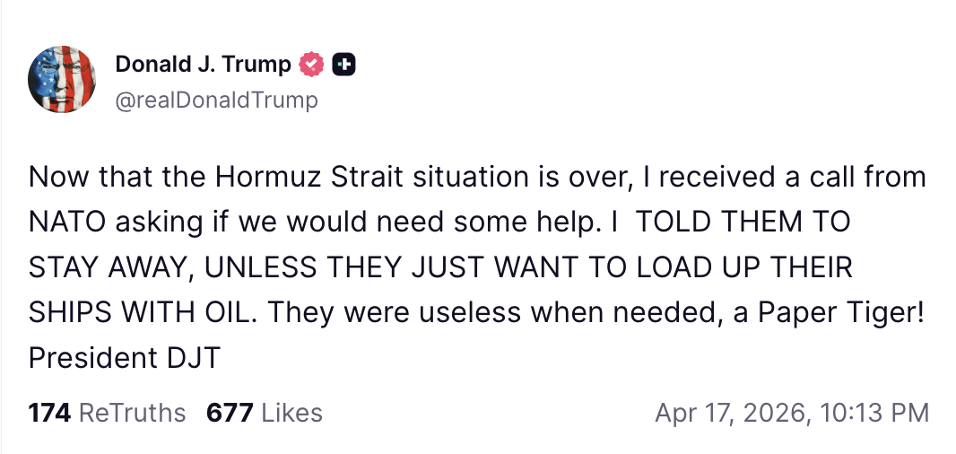 美國總統川普(Donald Trump)隨後在他的社群平台Truth Social發文再次強調海峽已全面開放,並簡短寫:「謝謝!」川普寫道:「荷姆茲海峽已全面開放,可正常進行商業活動與全程通行;但針對伊朗的海上封鎖措施將持續全面有效,直到我們與伊朗之間的協議100%完成為止。目前絕大部分條件都已談好,相信很快就能處理完畢。」