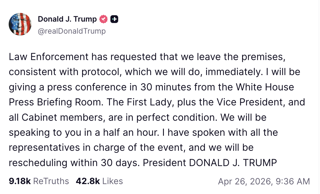 所有聯邦官員,包括川普本人,均確認安全。川普在被撤離約一小時後於他的群平台Truth Social發文表示:「槍手已被逮捕」。川普寫道:「華盛頓今晚相當不平靜。特勤局與執法部門表現非常出色。」隨後他再度發文指出:「第一夫人、副總統,以及所有內閣成員狀況完全良好。」並表示將於當晚在白宮召開記者會。