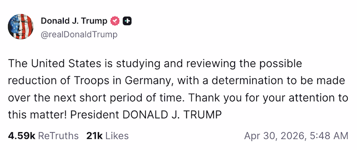 路透報導,川普在Truth Social上表示:「美國正在研究並檢討是否要削減駐德美軍的人數,近期內就會做出決定,感謝大家對這件事的關注!」