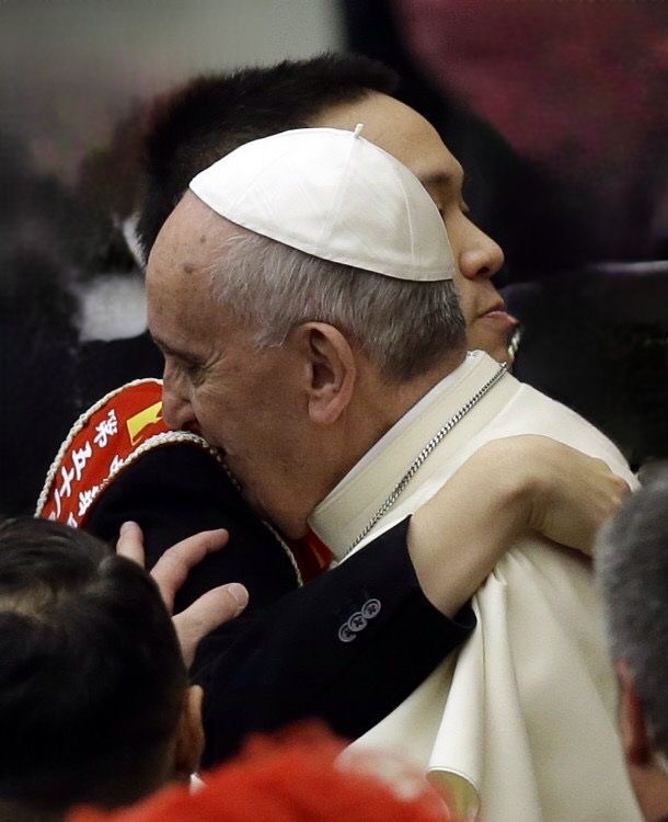 教宗方濟各接見李柏毅時,先握手寒暄致意,李柏毅也將一幅此次展出的「教 宗方濟各」畫作當面呈獻給教宗。教宗和藹地摸著李柏毅的頭並劃上十字,為 他降福,李柏毅也以英語向教宗自我介紹,說我是來自台灣的畫家,隨後並回 報以熱情的擁抱。教宗更對李柏毅說:「我會為你祈禱,請你也為我祈禱。」雙 方互動良久,場面溫馨感人,教宗與李柏毅擁抱的照片經過合眾國際社(UPI)傳 到全世界、成功地展現了台灣的軟實力及正面形象。在這一個禮拜的相處中, 我發現李柏毅是一個非比尋常的天才,他沒有拜過老師,作畫完全是天賦異 稟。我送給李柏毅幾本梵蒂岡博物館及義大利名畫書籍,他翻了幾下就放下來 了,我以為他沒有什麼太多興趣,第二天我問他喜不喜歡這些書的時候,他卻 可以很清楚的說出他喜歡書裡那些畫,我感覺他的眼睛好像是一個掃描器,看 過之後就把書掃描存在腦海裡了。記得有一個晚上,我帶他們從旅館轉彎抹角 上上下下的走了一段好長的路到一家餐廳用餐,餐畢回旅館時,李柏毅一馬當 先頭也不回地帶我們走回旅館,我心裡想羅馬這麼複雜的巷弄,他居然走一 遍,就能在三更半夜把我們帶回去了,真是不可思議。