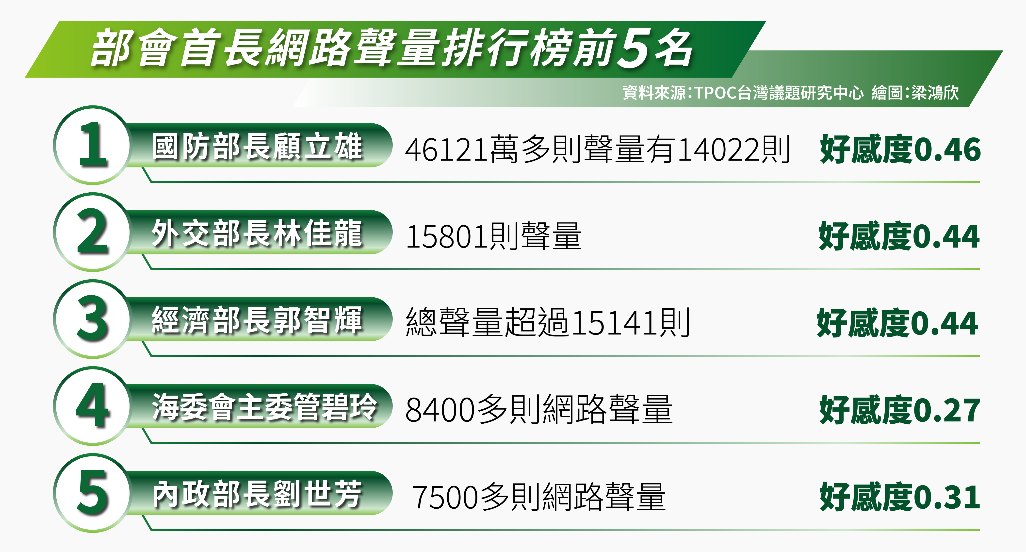 TPOC台灣議題研究中心指出,「部會首長網路聲量排行榜TOP10」,第一名是國防部長顧立雄,過去一個月,由於中國對台軍演、對台發動灰色地帶襲擾戰術等因素,顧立雄頻頻回應國安議題,也在立法院公開表達「現無反攻大陸政策」回應國民黨立委提問,受到廣泛關注。另一方面,顧立雄上任後推動改革,包括取消官兵休假回報、傳統刺槍術,還宣布陸官校慶「不再踢正步」,也引發正反熱議。在調查期間內獲得46121萬多則聲量,總聲量遠超於其他閣員,然而負面聲量也居冠,有14022則,好感度約0.46。